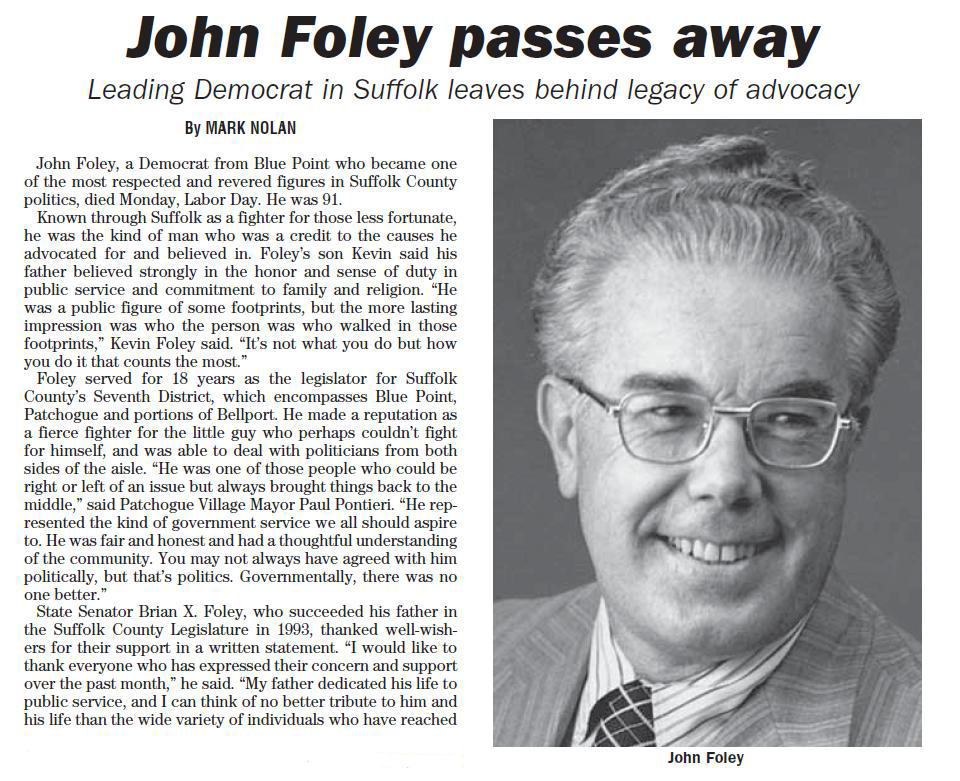 John Foley, a pioneer Democrat who served 18 years as a Suffolk legislator - longer than
