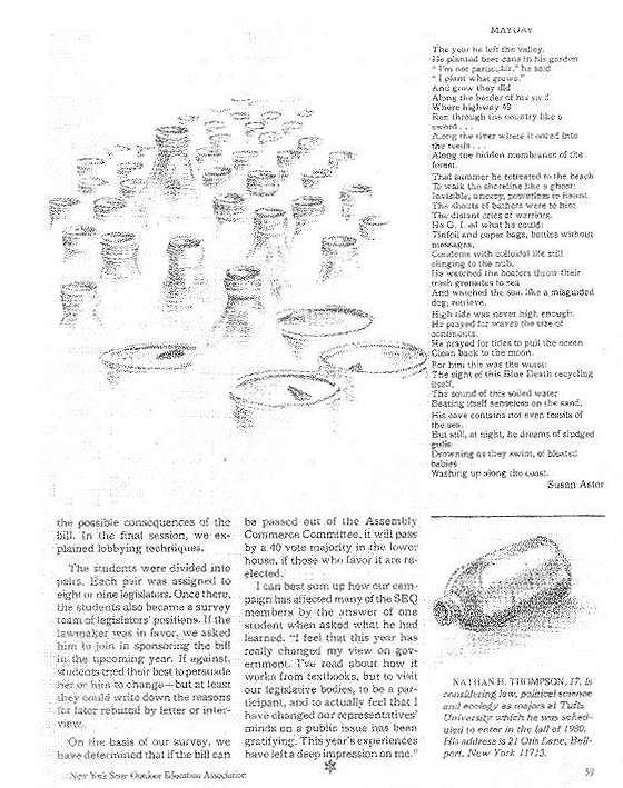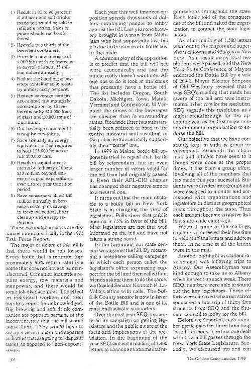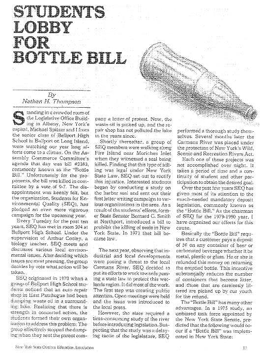 Dear Reunion members: This addendum is to show that the teacher is still being edited by a student and he is very appreciative that what was an oversight has been pointed out. This email is to note that I should have included the effort by SEQ to achieve a bottle deposit on beer and soda containers, first in Suffolk County and a short time later in New York State. SEQ played a major role in both efforts which were successful. I have attached an article written by Nathan Thompson and published in The Outdoor Communicator about SEQ’s efforts. Warm regards and thanks for noting this serious omission. |