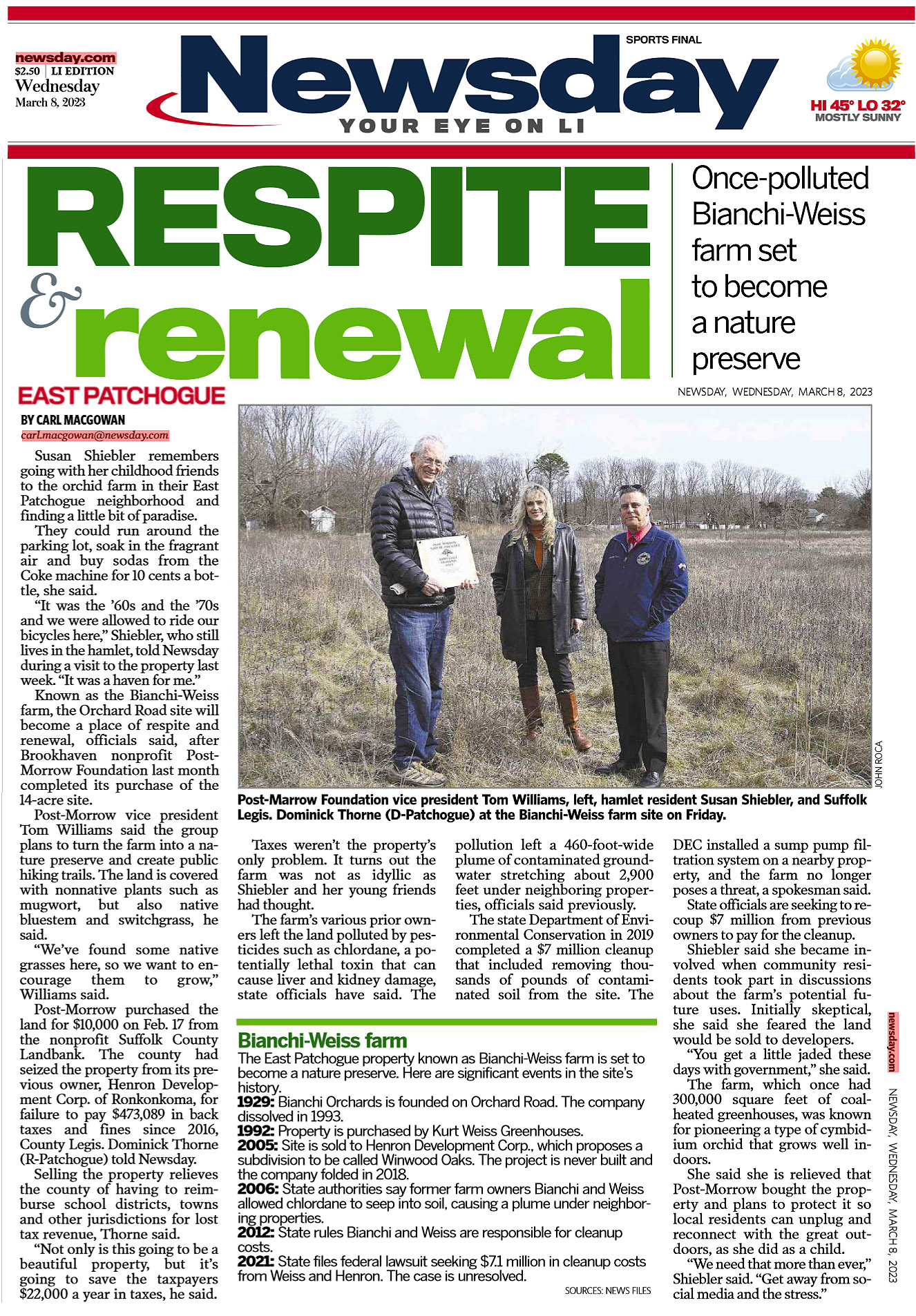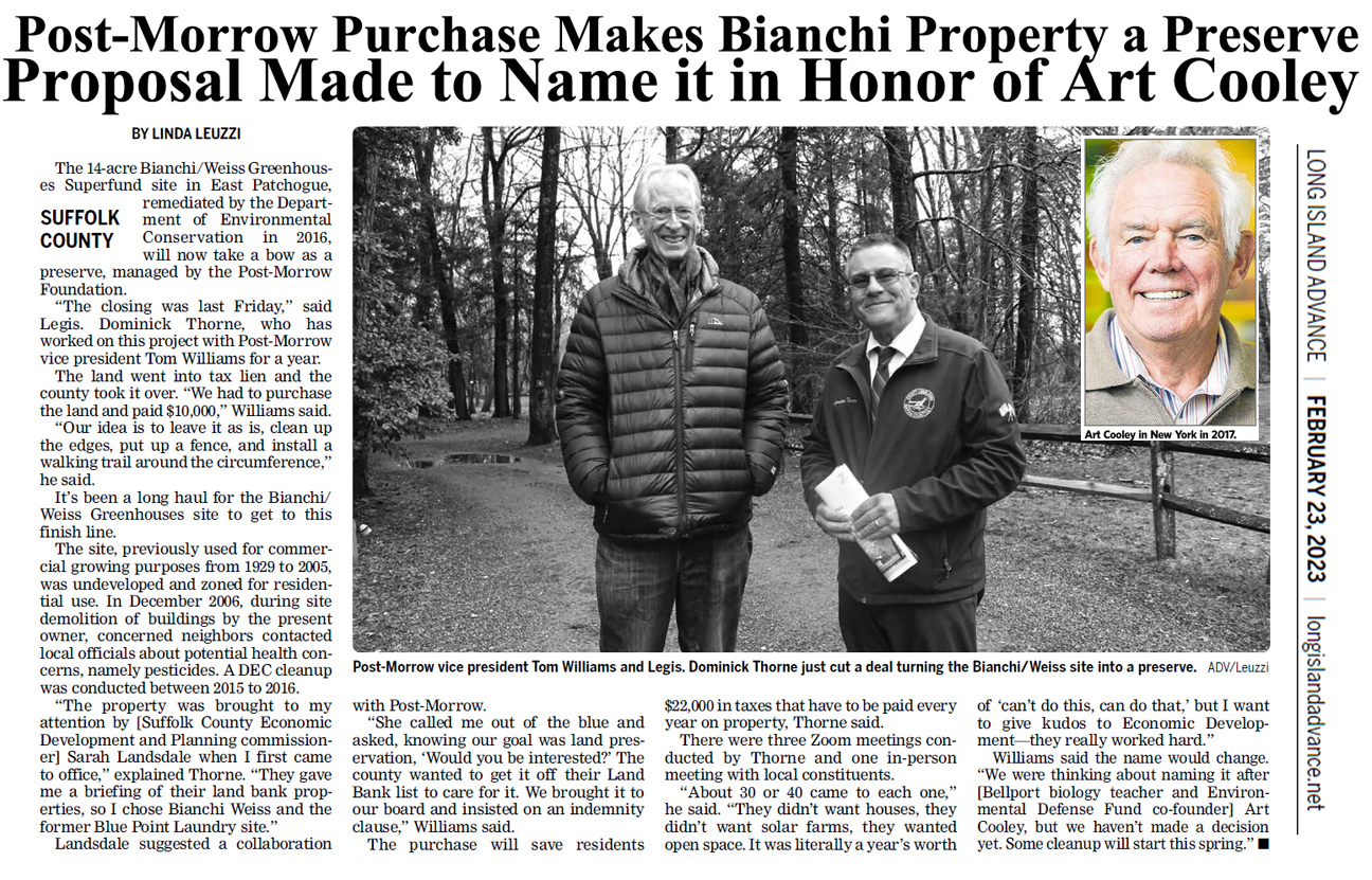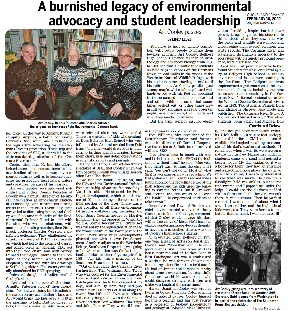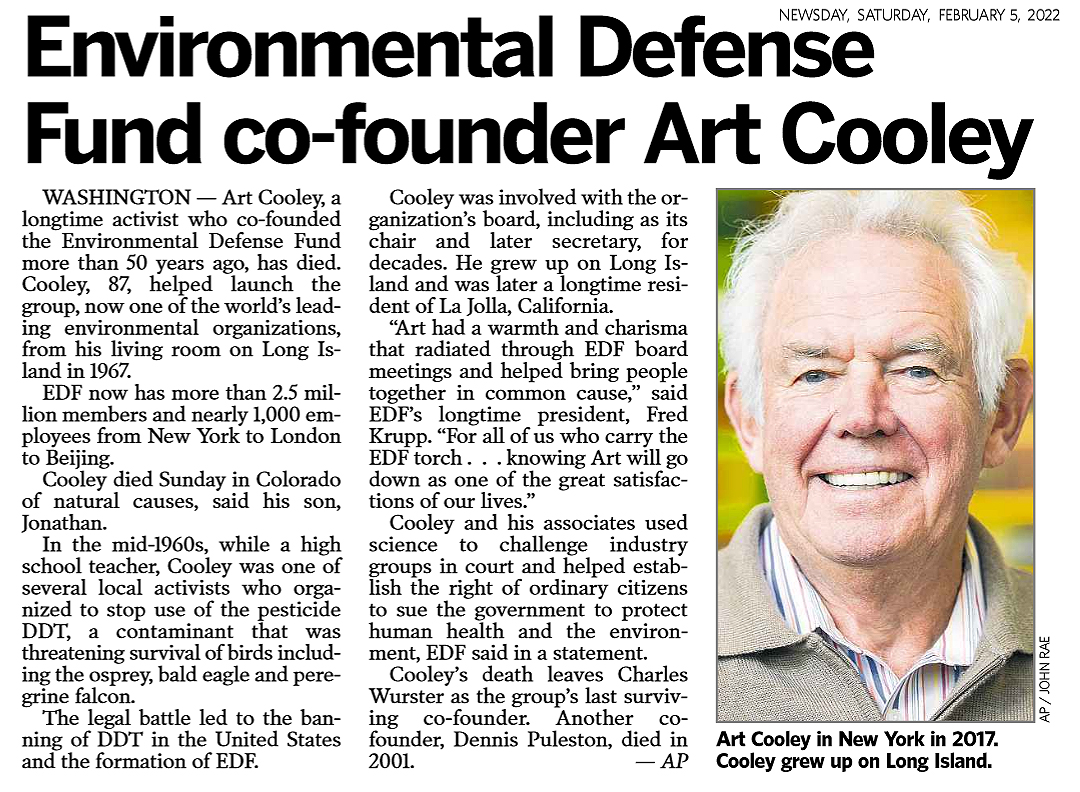 Art Cooley Founder of the Environmental Defense Fund He was part of a small group of scientists and citizens on Long Island that was instrumental in banning the toxic pesticide DDT, first locally and then nationally. Art Cooley, a high school biology teacher who was part of a small band of people whose concerns about issues like the toxicity of the pesticide DDT led them in the late 1960s to start the Environmental Defense Fund, which went on to become one of the nation’s largest environmental organizations, died on Jan. 30 in hospice care in Grand Junction, Colo. He was 87. In the fall of 1965, he and about two dozen scientists, conservationists and high school students began gathering monthly in their homes on Long Island, including Mr. Cooley’s in East Patchogue. They discussed environmental issues facing Long Island, including preserving wildlife habitats and dealing with groundwater pollution, and voiced their hopes for policy changes in letters to government officials and newspapers. Mr. Cooley, who was teaching at Bellport High School in Brookhaven, became the group’s unofficial leader. “Art was very adept at dealing with people and making friends,” Charles Wurster, one of the other founders of the Environmental Defense Fund and a former professor of biological sciences at what is now Stony Brook University, recalled in an interview. “His mind was very logical, he was very strategic, and he knew a lot about environmental issues.” The group, which called itself the Brookhaven Town Natural Resources Committee, focused first on trying to halt the use of DDT, which Suffolk County had sprayed on marshes since the 1940s to control mosquitoes. It was a ripe target. The toxic effects of pesticides had been the subject of Rachel Carson’s influential 1962 book, “Silent Spring.” And Mr. Cooley and another member of the group, Dennis Puleston, sensed that DDT had caused the local osprey population to decline. Litigation became the committee’s instrument of change. It sued the Suffolk County Mosquito Control Commission in 1966, which led a state judge to issue a temporary injunction against the use of DDT. The injunction stayed in effect for more than a year before the judge dismissed the lawsuit, ruling that the issue should be decided by the State Legislature. But the injunction provided enough time for the mosquito commission to say it would not use DDT for at least a year, and for the Suffolk County Board of Supervisors to outlaw its use. New York State banned it in 1971. Emboldened, some members of the group incorporated the Environmental Defense Fund in 1967, “with the express purpose of going after DDT,” Mr. Cooley told Voice of San Diego, an online website, in 2009. He added: “The first meeting was in my living room. I was chairing the meeting. I said, ‘Well, I think we should have a motion to proceed with due caution,’” because of the fund’s lack of financial resources. “An hour later, we passed a motion to sue the state of Michigan.” As a result of a lawsuit filed by the fund in Michigan, nearly every city stopped using DDT, and an application of another pesticide, dieldrin, in Western Michigan, to fight Japanese beetles, was delayed for a year. A lawsuit against the City of Milwaukee led it to end its use of DDT to fight Dutch elm disease. Another suit, filed jointly with the Citizens Natural Resource Association, led the State of Wisconsin to ban DDT. One of the group’s landmark achievements came in 1972: the banning of DDT by the Environmental Protection Administration, with minor exceptions. That ban evolved from a lawsuit the E.D.F. and other groups, including the Sierra Club, had filed against the federal government. Because Mr. Cooley was not an expert on DDT, as Mr. Wurster was, he did not testify in the lawsuits. He worked in the background with the Environmental Defense Fund while continuing to teach; he took students on river and wildlife field trips, and he advised Students for Environmental Quality, a club that started in 1970 at his high school and gave its members a group outlet to pursue solutions to problems like pollution in Swan Lake in East Patchogue. “In time, it served as the vehicle for students to investigate other issues, learn about them and plot a course of action,” Mr. Cooley told the South County Retired Educators Association’s newsletter. Arthur Paul Cooley was born on June 2, 1934, in Southampton, on Long Island, and raised in nearby Quogue. His father, Harvey, was a school principal and the mayor of Quogue. His mother, Helen (Coller) Cooley, was a homemaker who also made furniture. Mr. Cooley earned bachelor’s and master’s degrees in biology from Cornell University and joined the staff of Bellport High School in 1956. In addition to biology, he taught general science, ornithology, earth science, mathematics, and a course on gardening and wild foods. Mr. Cooley would go on to serve as the E.D.F.’s secretary, as its chairman from 1972 to 1975, and as an active board member until about a year ago. The fund, which had little money early on, reported $221 million in support and revenue in its 2020 fiscal year. “He had enormous influence in our boardroom,” Fred Krupp, the organization’s president since 1984, said in an interview. “He advocated that we listen to all stakeholders, from companies to labor unions to grass-roots groups. That generosity of spirit, of not wanting to demonize anybody, became our path.” After his retirement in 1989, Mr. Cooley moved to San Diego and became a guide on exotic cruises around the world with Lindblad Expeditions. In addition to his son, he is survived by two grandchildren. His marriage to Nancy Nienstedt ended in divorce. Mr. Cooley reflected on the impact of the battles against DDT in Mr. Wurster’s 2015 book, “DDT Wars: Rescuing Our National Bird, Preventing Cancer, and Creating the Environmental Defense Fund.” He was especially pleased, he said, by th